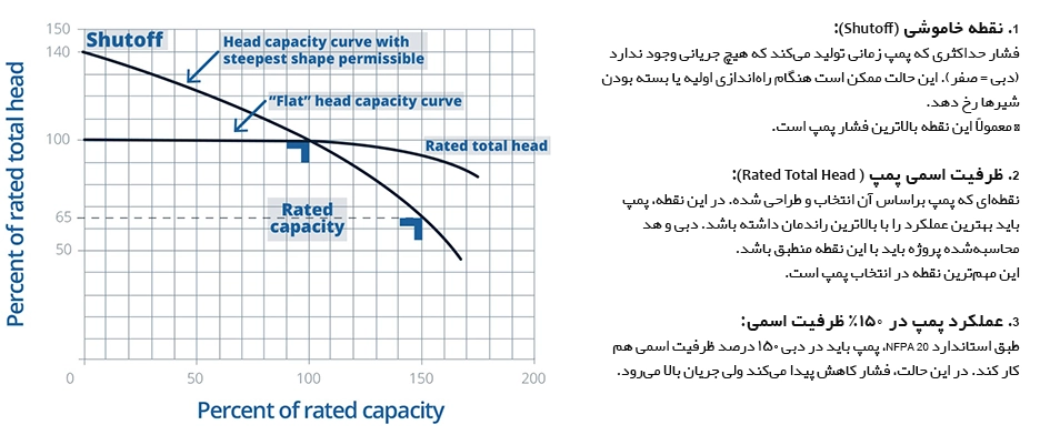 انتخاب صحیح پمپ آتشنشانی به دو عامل کلیدی بستگی دارد: دبی (Flow Rate) و هد (Head). این دو عامل مشخص میکنند که پمپ چه میزان آب را با چه فشاری باید در لحظه آتشسوزی تأمین کند تا سیستم اطفای حریق بتواند به درستی عمل کند.