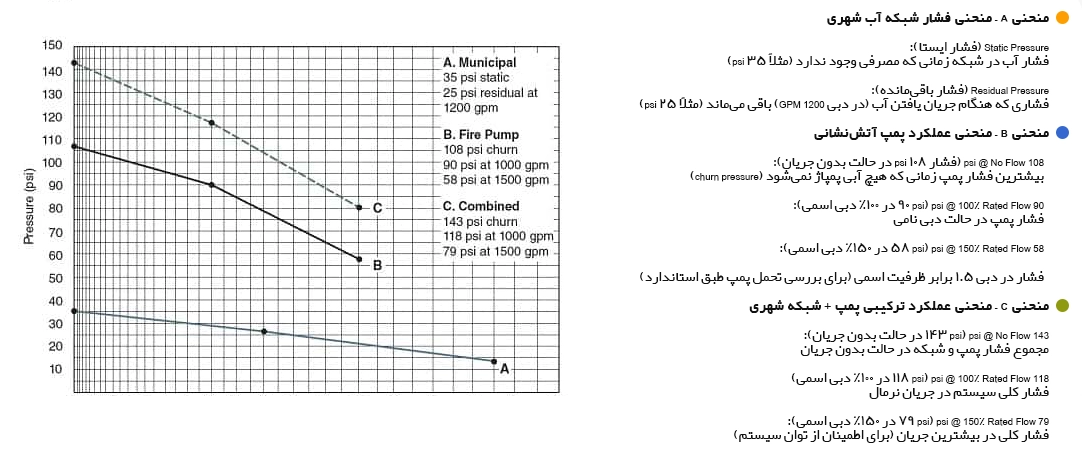 هد استاتیک (Static Head): ارتفاع عمودی از پمپ تا بالاترین نقطه مصرف (معمولاً آخرین اسپرینکلر یا فایرباکس).